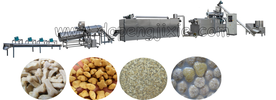 Mixer→ screw conveyor→extruder →air conveyor→oven→flavoring machine→cooling conveyor→sifter-packing machine