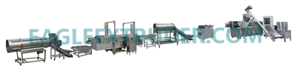 拌料機--輸送機—膨化機--成型切斷機--輸送機--油炸鍋--提升機--調味機
